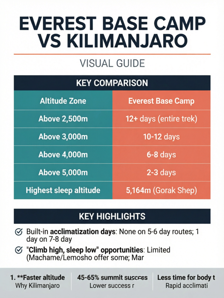 The critical insight: EBC spends nearly a full week above 4,000m, allowing gradual acclimatization through the "climb high, sleep low" principle. Kilimanjaro spends only 2-4 days above 4,000m (route dependent), with most routes ascending too rapidly for optimal adaptation.