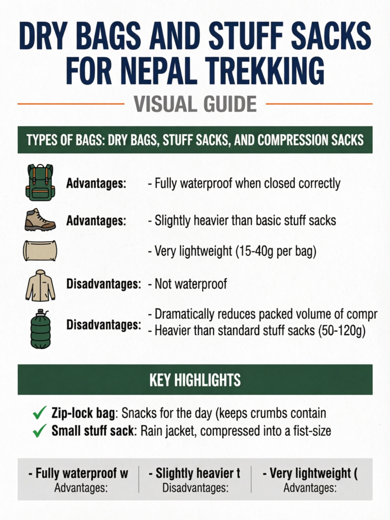 Every Nepal trekker needs a minimum of two dry bags (sleeping bag and electronics), two to three stuff sacks (clothing, toiletries, laundry), and several zip-lock bags (documents, medications, snacks). The complete system weighs 150-400g and costs $15-100 depending on whether you choose premium brands or budget alternatives.