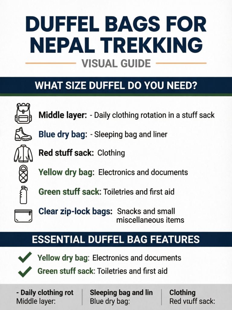 Duffel bag sizing for Nepal trekking depends on your trek type, the season, and how disciplined your packing is.