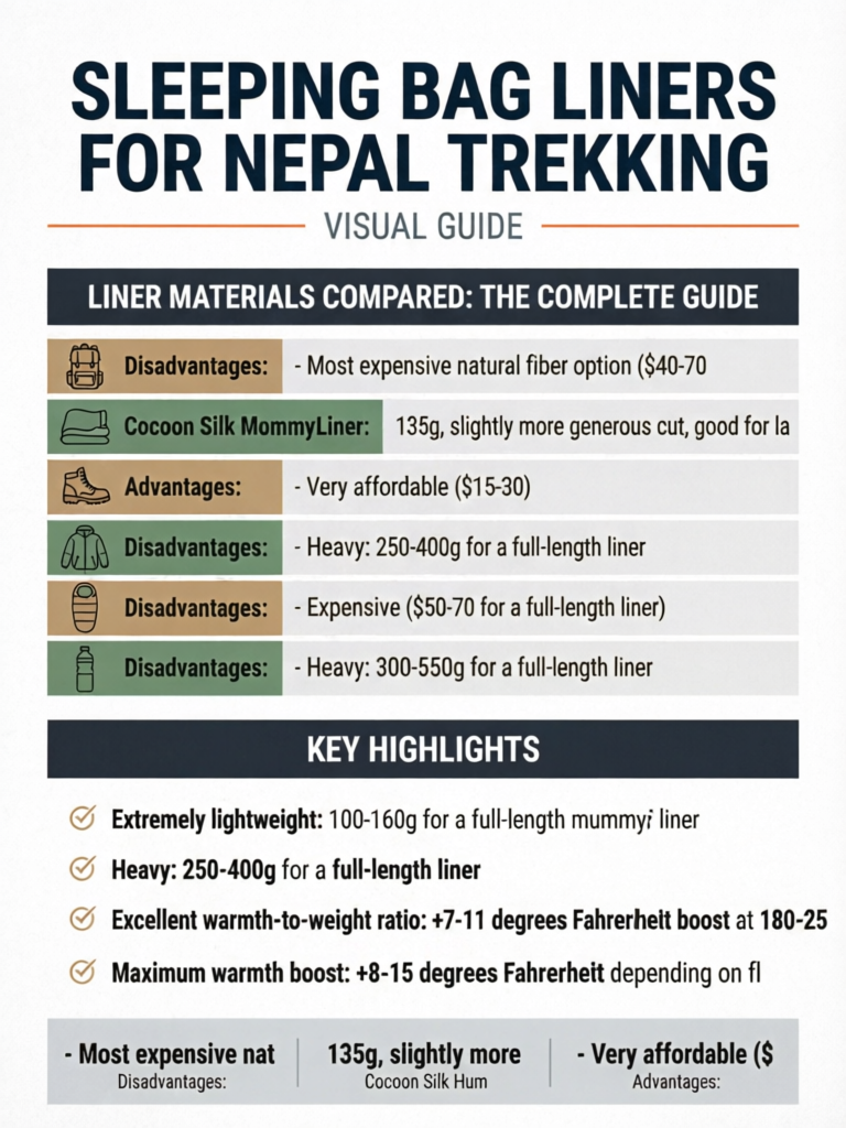 This guide covers every liner material available, honest temperature boost numbers from real-world testing (not optimistic manufacturer claims), the specific scenarios where each material excels, and a clear recommendation for every type of Nepal trek and every budget level.