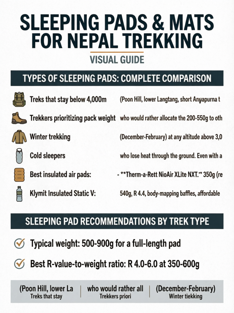 Best choice: Therm-a-Rest NeoAir XTherm NXT (430g, R 7.3, $230) -- the highest R-value-to-weight pad available. Combined with a closed-cell foam pad underneath (R 2.0, 200g for half-length), you achieve R 9.3, which handles the most extreme conditions on Nepal's trekking peaks.