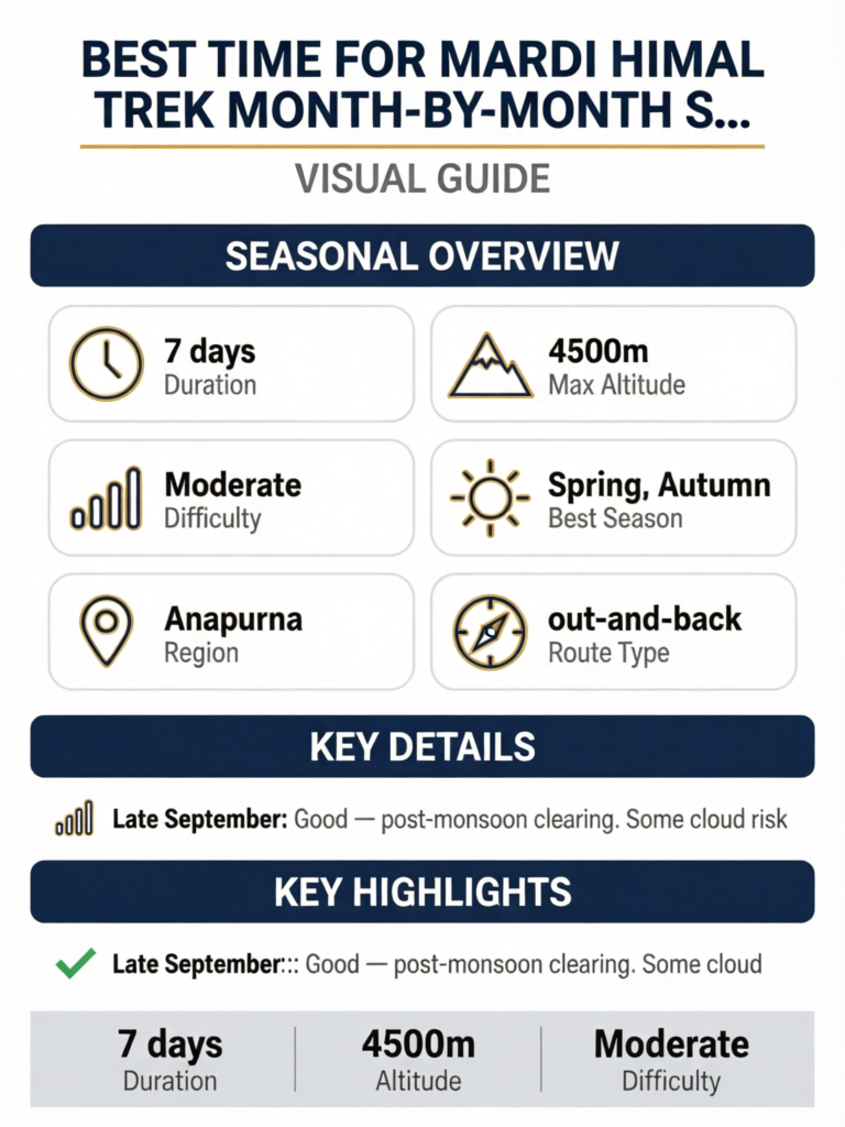 The Mardi Himal trek shares the Annapurna region's general seasonal pattern but has some unique characteristics. The exposed ridgeline between High Camp and Upper Viewpoint is significantly more wind-exposed than the sheltered Annapurna sanctuary, making wind as important as precipitation in seasonal planning.