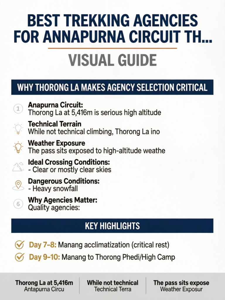Thorong La Pass (5,416m) is the crux of the Annapurna Circuit. This single crossing determines whether your 14-21 day journey succeeds or fails. Understanding what makes Thorong La challenging explains why agency expertise here matters more than on any other aspect of the trek.