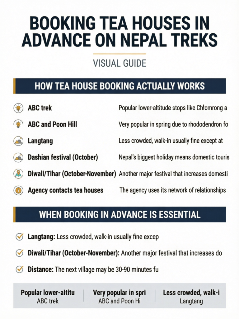 The tea house booking situation in Nepal occupies a middle ground between the fully-booked hotel system you know from cities and the completely informal camping-wherever-you-want approach of wilderness backpacking. For most trekkers, the best approach is pragmatic: book the critical bottleneck nights, walk in everywhere else, arrive early, and maintain flexibility.