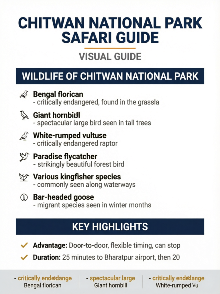 Chitwan is one of the premier birdwatching destinations in Asia, with over 600 recorded species. Even casual observers will notice the remarkable diversity, from giant hornbills to tiny kingfishers. Key species include: