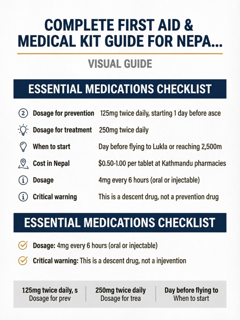 Your trekking medical kit should function as a portable pharmacy capable of treating the most common and serious conditions you'll encounter in Nepal's mountains. This isn't about bringing every possible medication—it's about strategic preparation for the specific medical challenges of high-altitude trekking.