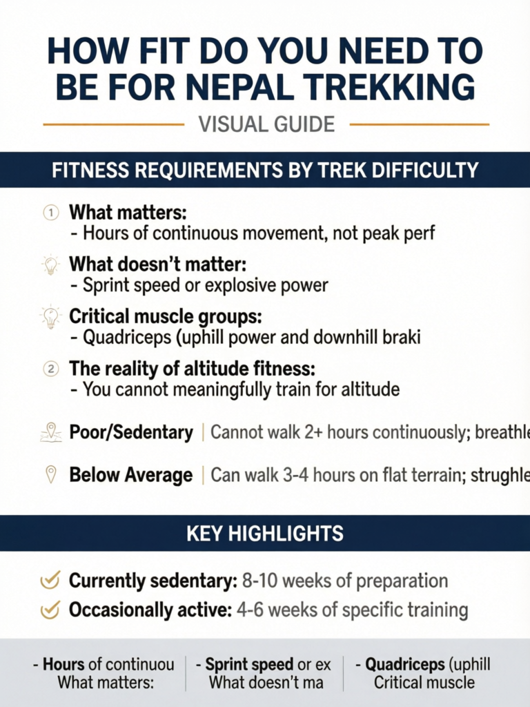 The bottom line upfront: If you can hike 6 hours with 700+ meters elevation gain while carrying 8-10 kg without severe exhaustion, you're fit enough for most moderate Nepal treks. If you cannot, you need specific training. This guide shows you how.