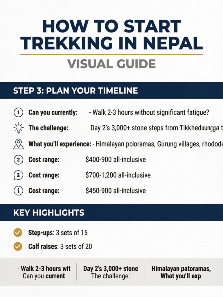 Even "easy" Nepal treks involve 4-6 hours of daily walking on uneven terrain, often with significant elevation gain. The stone staircases on popular routes can exceed 3,000 steps in a single day. If stairs currently leave you breathless, you need 3-4 months of dedicated training before considering a trek.