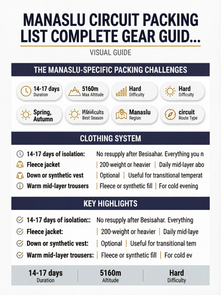 This is not a list of what is nice to have. Every item below is tested against the specific conditions of the Manaslu Circuit — the cold nights in Samagaon, the 4:00 AM start in -15°C at Dharamsala, the long rain-soaked days in the lower Budhi Gandaki gorge, and the 22km descent from Bimthang after the pass crossing.